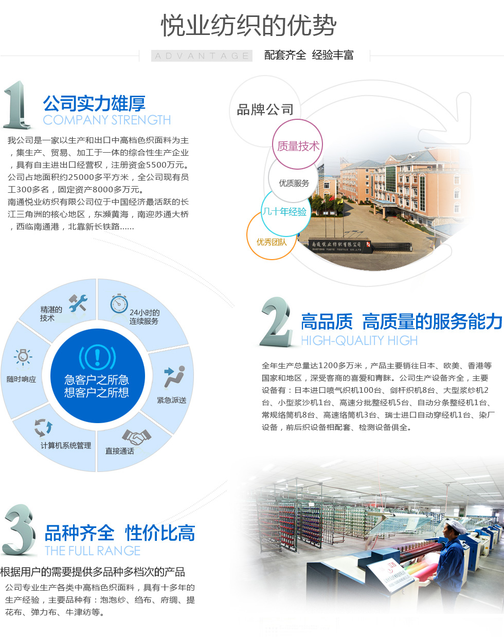南通悅業(yè)紡織有限公司位于中國(guó)經(jīng)濟(jì)最活躍的長(zhǎng)江三角洲的核心地區(qū)、中國(guó)近代第一城—江蘇省南通市,是一家以生產(chǎn)和出口中高檔色織布為主業(yè)的集生產(chǎn)、貿(mào)易、加工于一體的企業(yè),具有進(jìn)出口經(jīng)營(yíng)權(quán),注冊(cè)資金5500萬(wàn)元。 公司常年生產(chǎn)各類(lèi)中高檔色織面料,品種有:全棉色織布,cvc、T/C、青年布...
